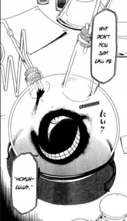The other reference that made this enemy the Homunculus is of course the manga Fullmetal Alchemist. In a flashback, we learn of the origin of the heroes' father, Van Hohenheim: a slave to an alchemist, he became linked to the "little man in the flask" through his blood. That creature taught him alchemy while tricking him to create the Philosopher's Stone, sacrificing his country in the process. That and the manga's "equivalent exchange" rule played a big role in the notion of sacrifice that is heavily present in Corpus et Spiritus: you have a give something up to gain something else.